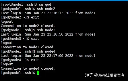 免密配置完成,god用户可以毫无阻碍登录二,三,四节点了。