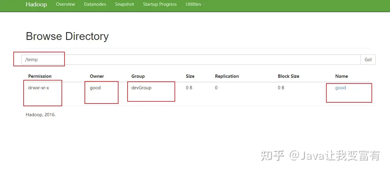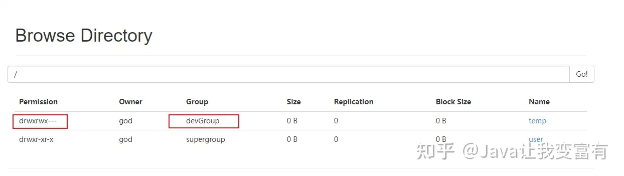 hdfs不能够创建用户,但是有用户组和权限的api操作。我们使用god用户创建一个目录,并把该目录归属给某个特定的组。如下