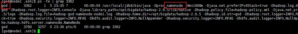 查看进程详情,会发现我们使用god用户启动了namenode进程。