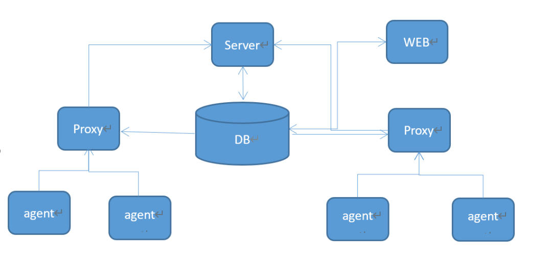 Proxy:proxy连接到server,并请求配置数据。从agent收集数据,所有数据均在本地缓存,然后发送给server。需要独立的数据库。