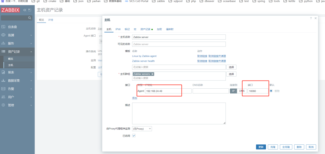 vi /data/zabbix/etc/zabbix_agentd.confServer=192.168.24.49ListenPort=10080 //agent portServerActive=192.168.24.49 //Zabbix server/proxy address