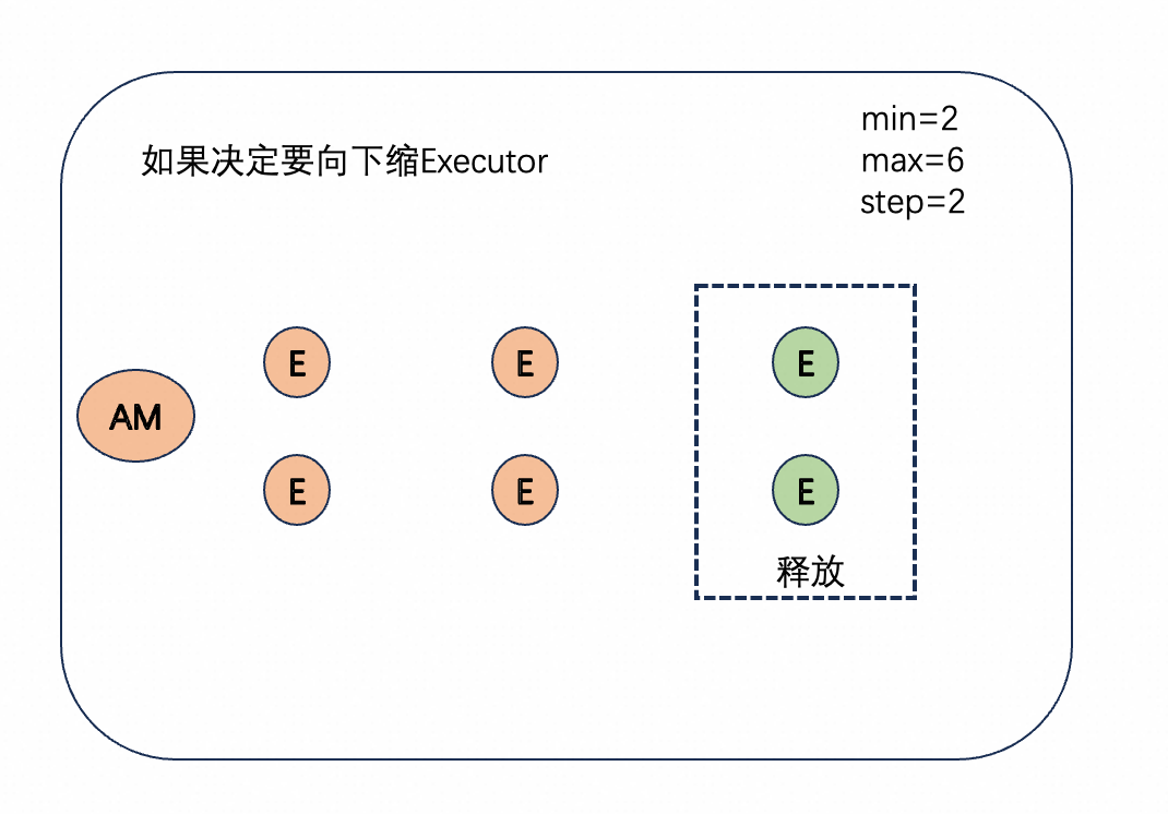 上图是一个缩容时的示意图,当判断满足缩容的条件时,会按照step的大小选择对应数量的executor,然后释放pod。在节点释放后,该节点的计费也随之暂停。▶︎ 延迟调度