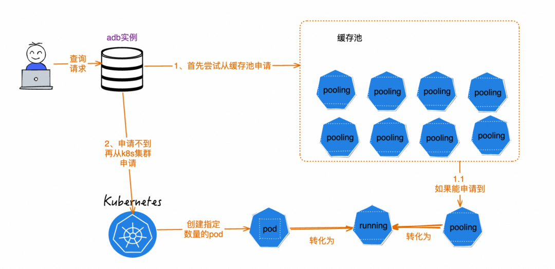 原先的申请采用了直接从k8s服务申请pod的方式。每次在查询请求到来时,会根据查询指定的资源量,申请对应数目的pod,然后在pod上启动ADB的服务。池化是计算机领域的一个热门概念,通过实现的预热启动一批资源,在实际使用时不再需要额外的申请时间,而是直接使用即可,比如经常使用的线程池就使用了池化的思想。ADB的资源热池也用到了池化的思想。在每一个Region都构建资源热池,在其中预热地启动一批executor节点。会并行构建多个不同版本的资源热池,以支持实例版本不同的客户。
