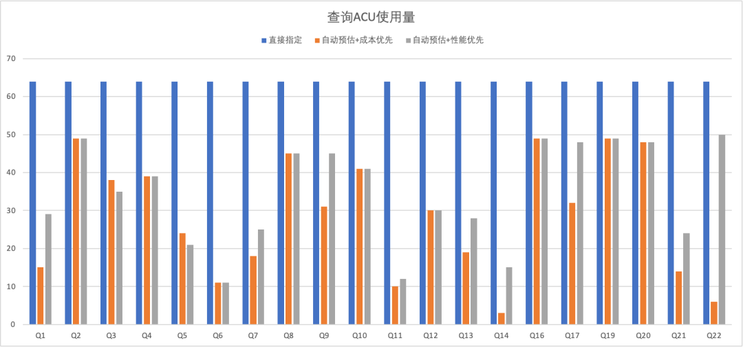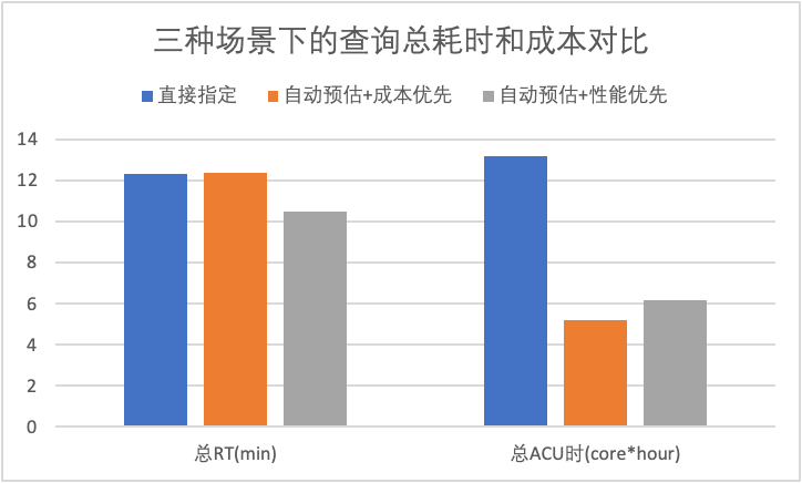 在成本优先模式下,所有查询的总耗时RT与直接指定持平,成本上(即总ACU时)会有降低约60.5%。在性能优先模式下,所有查询的总耗时RT会降低15%,但与此同时,成本也依然能节约53.2%。
