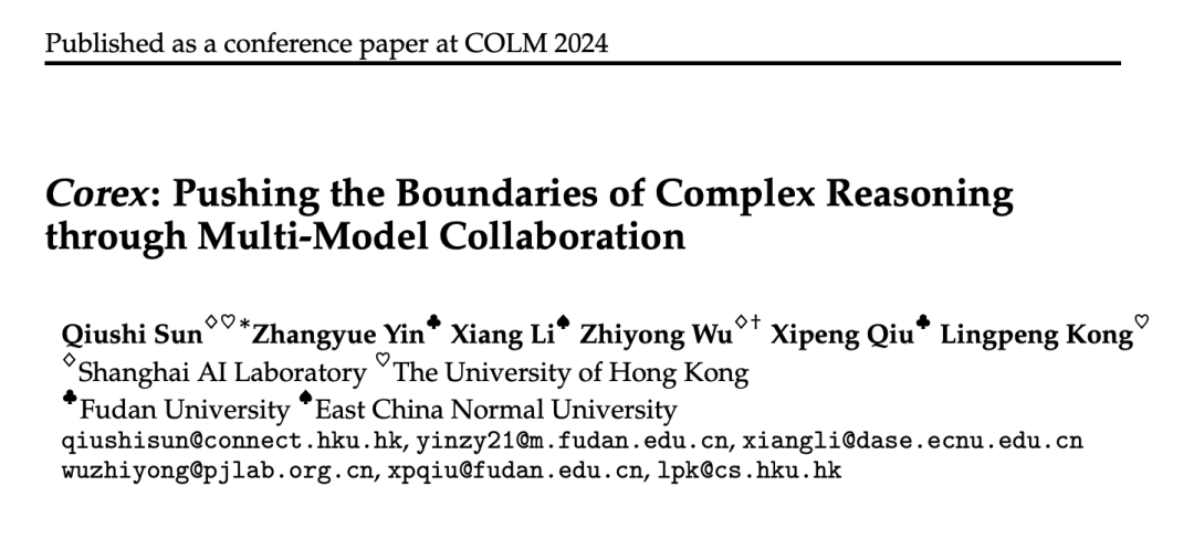 今天分享的是上海人工智能实验室和几所高校合作发表在COLM2024的一篇文章 Corex: Pushing the Boundaries of Complex Reasoning through Multi-Model Collaboration