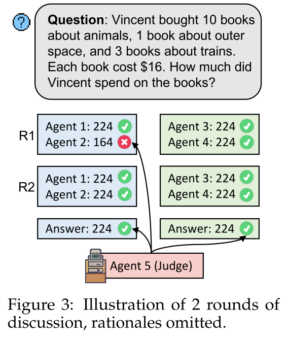 这个模式主要基于团队讨论的方法来增强LLMs之间的信息交换,从而提高它们的事实准确性。具体来说,这种方法将LLM代理随机分成两个小组——蓝队和绿队,并且还有一个代理作为裁判()。每个团队内部进行多轮的迭代讨论,在每一轮中,代理们会改进他们的推理链和预测。在每轮讨论结束时,两队会提交他们改进后的预测。如果两队的预测一致,则讨论顺利结束;如果有差异,则所有轮次的输出都会提交给裁判。裁判使用一个决策过程来评估整个讨论过程中各轮的推理链和预测的质量,最终做出综合评价和更为精准的决定。