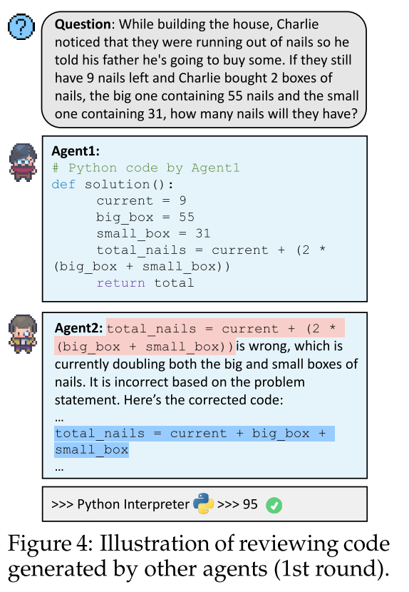 CoT方法以其解释的通用性和清晰度著称,但容易产生累积错误,并且通过提示提升文本质量的效果有限。另一方面,PAL通过程序保证了计算准确性,但可能存在LLMs误解问题的情况,导致虽然技术上正确但实际上误导性的程序生成,以及生成的代码中可能存在的bug,比如引用未定义的变量或执行除以零的操作。受到LLMs同行评审和软件工程中协作编码实践的启发,文中提出了一种多代理协作的方式-Review模式,来解决这些问题。在这个模式下,随机选择一个代理作为主要代理,负责形成初始解决方案集合 ,其中包括答案、推理链。随后,其他代理依次作为评审者对提供的或先前评审者修改过的解决方案进行严格的审查。每个评审者都会基于前一评审者的成果和反馈进行工作,从而逐步完善解决方案。