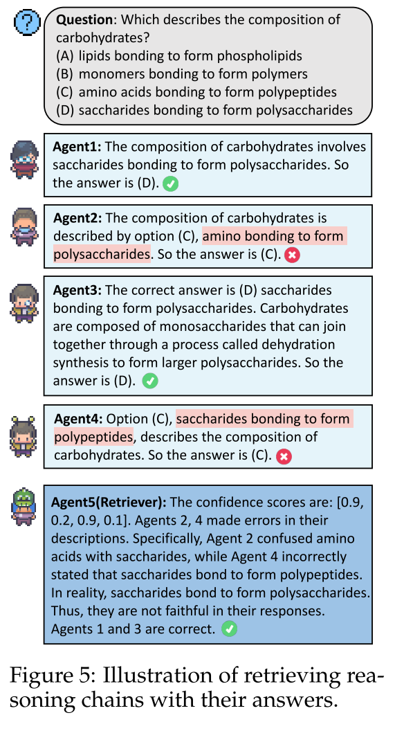 在检索模式中,对于给定的问题,我们从个代理中随机选择一个代理作为检索者。剩下的个代理独立地解决这个问题,每个代理生成自己的推理链和相应的预测,形成了一个候选池。然后,检索者审查候选池中的每一个,评估ci与pi之间的忠实度,并根据这一评估为每一对赋予一个置信分数,范围在[0, 1]之间,记为,其中fr表示检索者的评估过程。最后,通过比较所有候选对的置信分数,选择具有最高置信度的推理链-预测对作为最忠实的回答,将作为问题q的最终答案。