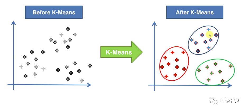 K-Means算法可以以一种算法的方式告诉我们最佳的聚类的方式,这里就得到了左下方红组,右上方蓝组的这样一个结论。
