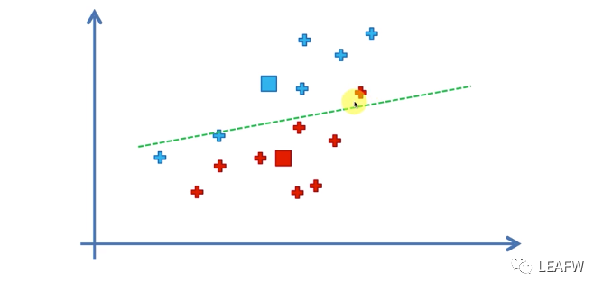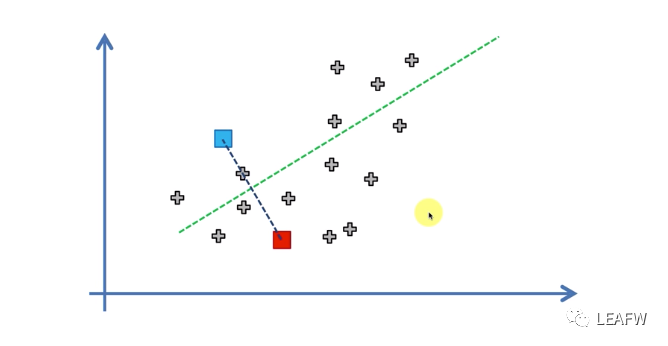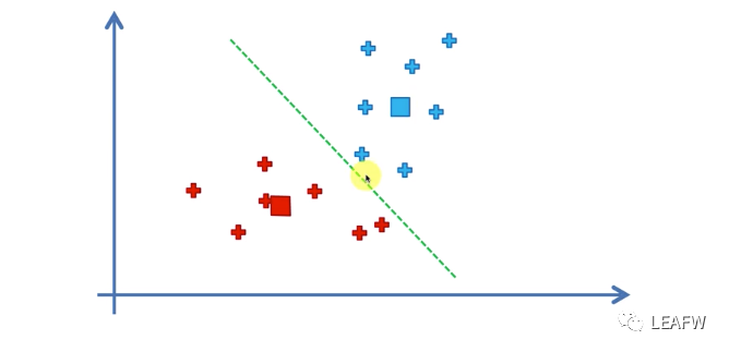 下面从具体的例子来讲述这个步骤。假设有一组数据,我们要分配成两类,即K=2;然后随机选择两个点,分别计算每个点距离这两个点的距离。这里可以有个比较简单的计算方式,我们作出这两个点的垂直平分线,那么这个绿线上方的点都是离蓝色点比较近,下面的离红色比较近。