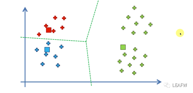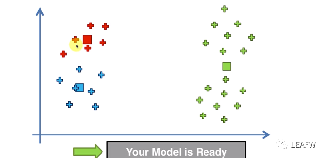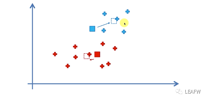 那么这时就需要对中心点进行位移,但由于这个位移是非常小的,所以新的分类结果和之前并不会有什么改变,所以算法就这样结束了。