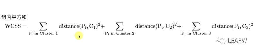 上文讲到的是选择中心点的陷阱,那么现在在谈谈如何选择类的个数。从直观上,上文中的图像大部分人应该很容易想到分为3组,也有的人可能想分为2组,但怎样选择才是最佳的分组方式是个需要好好研究的问题。首先来定义一个数学的量,组内平方和(WCSS)。