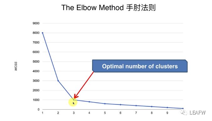 找到最像手肘的这个点,这里就是3,那么这个点,就是最佳的分组的个数。这个曲线上可以看到,从1到2,和2到3时,下降的速率都是比较快的,但从3往后,下降的速率都是非常小的,那么我们要找的就是这样一个点,在到达这个点之前和从这个点开始的下降,速率的变化时最大的。
