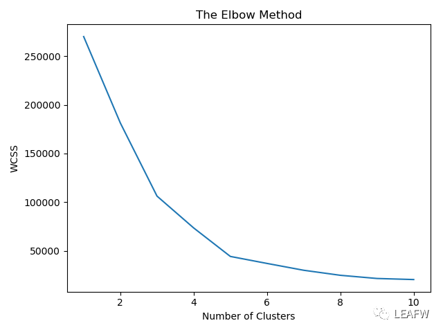 这里要介绍一个法则,叫做手肘法则(The Elbow Method)。我们把随着分组个数的增加,WCSS的结果的图像画出来。