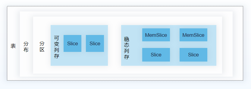 LSC表通过分布/分区/切片(Slice)三层来组织其数据。首先通过分布将数据打散到不同的数据节点,分布实质上是一个一级分区;然后在数据节点内通过分区进一步划分数据,LSC表支持Range/List/Hash等分区方式;在分区内数据由切片组成,切片又可以分为可变切片,内存切片,以及稳态切片。