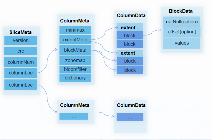 ColumnMeta:其中包含切片/块粒度的MIN/MAX统计信息、Extent元数据(Block的集合)、Block元数据、布隆过滤器、字典元数据等。