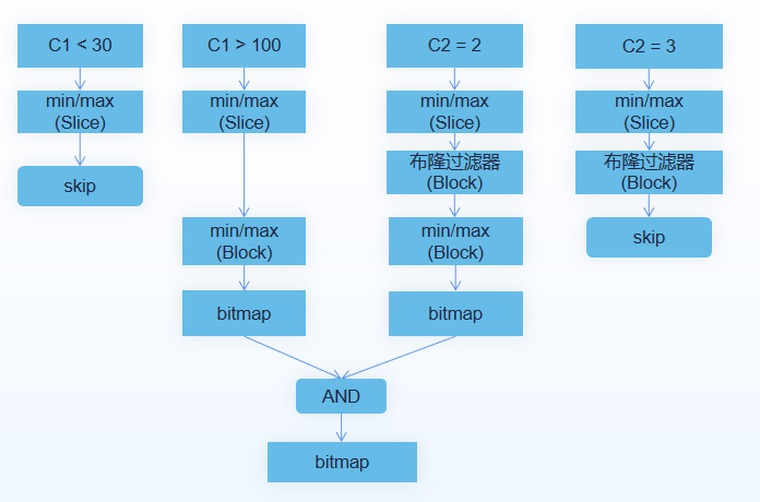 首先过滤列在 Slice粒度的MIN/MAX统计信息。如果不满足,则说明没有Block满足条件,可快速跳过该条件;其次过滤列在Block粒度的MIN/MAX统计信息,将条件与MIN/MAX向量做比较,得到满足条件的Block位图;最后过滤列上的布隆过滤器,用于等值条件快速过滤。