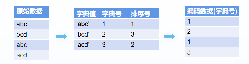 字典编码后列数据被转换为字典元数据和编码数据,其中字典元数据包含字典值、字典号、排序号。编码数据中存储的是字典号。