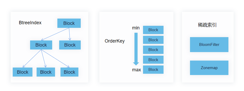 MIN/MAX统计信息也叫Zonemap,其和布隆过滤器都属于稀疏索引。稀疏索引作为元数据存储在ColumnMeta中。