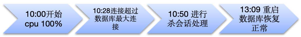 2024年4月2日上午10点00分到10点20分,某电力客户某系统数据库CPU使用出现异常增长,平均达到了90%以上,峰值达到了100%;会话数也从10点20分开始持续升高,持续到10点28分会话数超过数据库最大连接数8000,业务会话受影响;10点50分数据库部分空闲会话kill,数据库可以连接,此时数据库会话数降低到6000左右;最终13点09分左右对数据库进行了重启操作,数据库连接数稳定在2000左右,CPU使用率也维持到50%左右,业务彻底恢复正常。