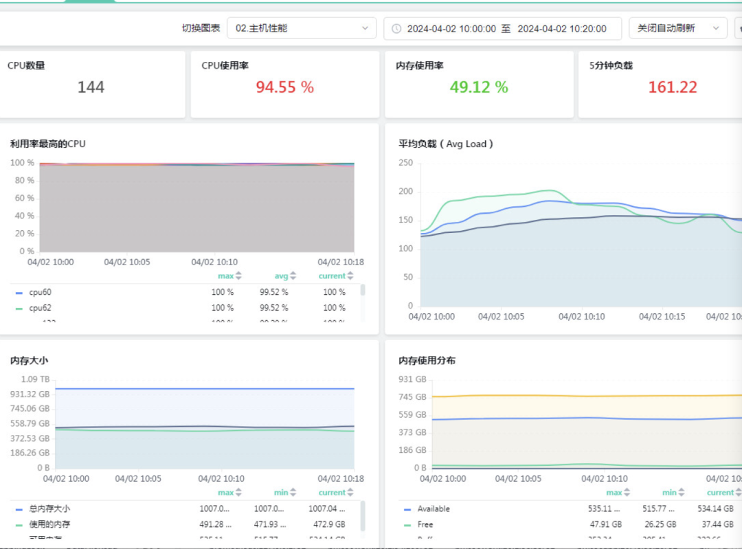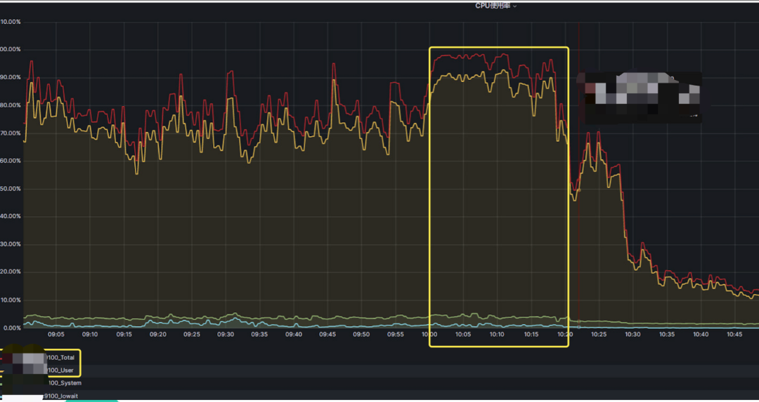 数据库主机10:00:00至10:20:00,主机的CPU平均使用率已经达到90%左右,峰值会达到100%。这一负载与平日系统性能标准有显著偏差,平日系统CPU平均使用率业务繁忙期也就70%左右,峰值90%左右。