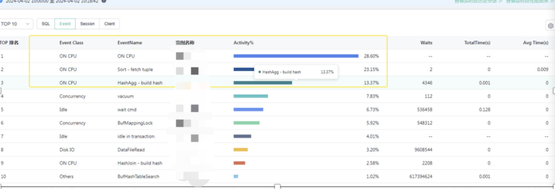 数据库主机CPU使用率100%的时间段的等待事件:10点00分到10点20分时间段内数据库主要等待事件分类是on cpu、sort-fetch tuple和hashAgg-build hash,上述三个等待事件占据了数据库活动时间的63%以上,该等待事件主要由于出现大量top sql,大量的逻辑读 hash join 导致。
