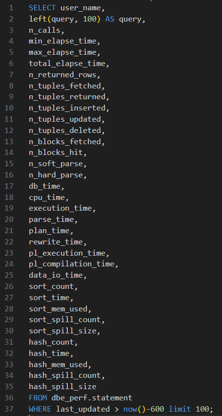 系统内一直有对dbe_perf.statement视图去做周期性的查询,获取相关的SQL语句用于监控,该SQL执行时间较长,单次需要20秒以上: