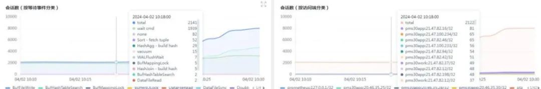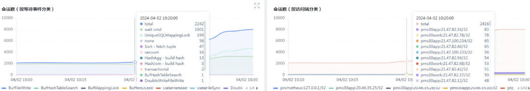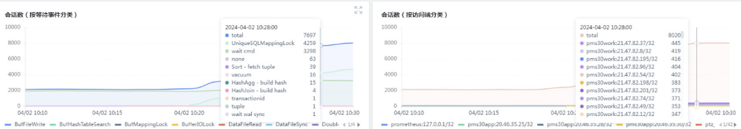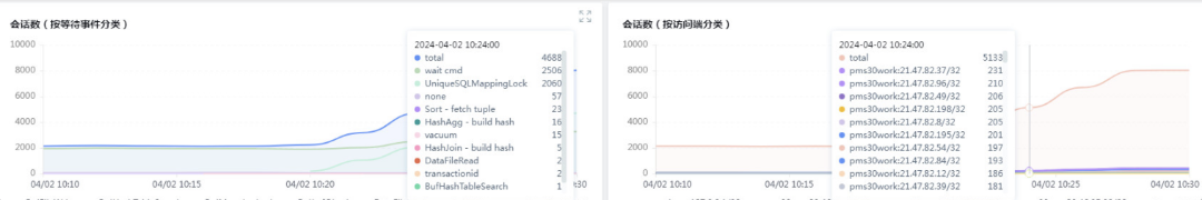 总体分析: 基于目前的信息判断本次会话数超过最大连接数的主要原因还是主机CPU使用率达到100%诱因,此时导致数据库出现了较多的ON CPU、sort-fetch tuple和hashAgg-build hash等待;系统内的instr_unique_sql_count参数是250000,track_activity_query_size之前被调整为102400,这个设置导致uniqueSQL区域内存非常大,达到了23GB,系统内还有周期性的查询dbe_perf.statement视图(该视图就是uniqueSQL区域对应的视图,由于uniqueSQL达到了23GB,此时查询该视图就导致特别消耗资源,需要时间接近20秒以上还查询不出来)数据获取SQL语句来监控,如果此时调整instr_unique_sql_count参数,则可能进一步加剧系统负载,出现更为严重的UniqueSQLMappingLock和on cpu等待,进而达到数据库最大连接数8000,严重影响业务运行。
