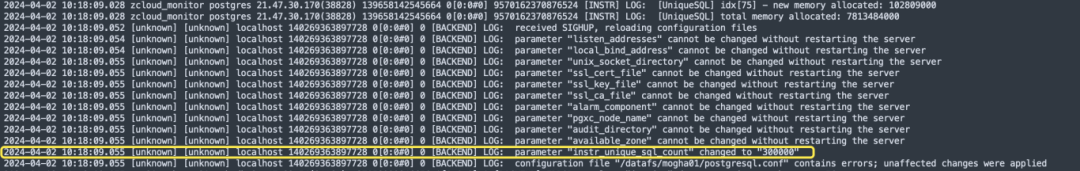 停机修改track_activity_query_size参数从102400降低到4096,为原来的4%,此时uniqueSQL区域将大幅度降低,也避免dbe_perf.statement视图查询时候出现的性能瓶颈。