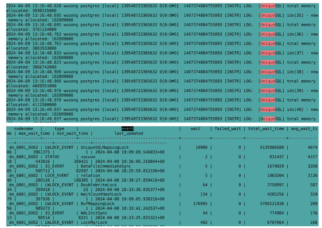 2、如果数据库在线调整instr_unique_sql_count参数期间,还有相关的UniqueSQLMappingLock资源请求发生(例如周期性的查询dbe_perf.statement视图获取相关SQL进行监控,该视图查询会请求UniqueSQLMappingLock资源),则可能触发和加剧更严重的等待竞争,例如出现严重的UniqueSQLMappingLock等待、on CPU等待。