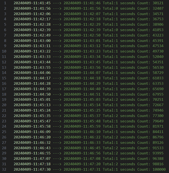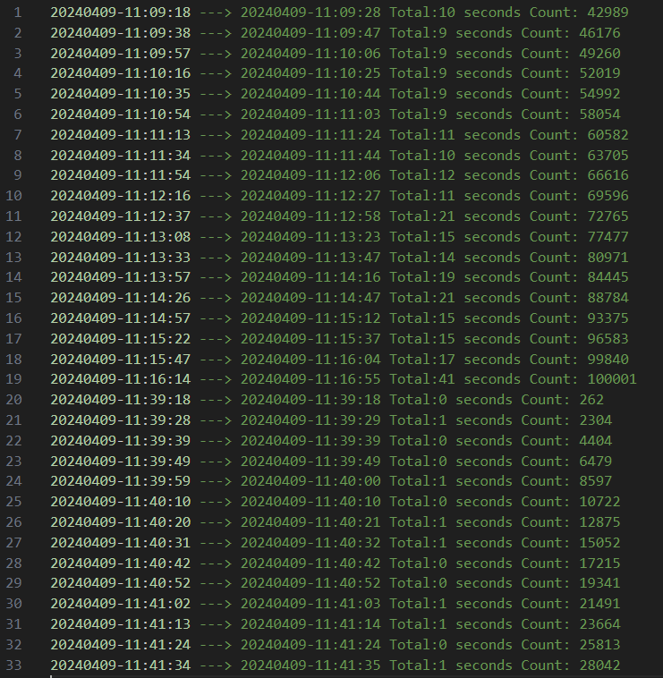 3. 参数track_activity_query_size 由51200 调整到1024 后, 相同测试条件下,dbe_perf.statement查询耗时如下。可以看到参数track_activity_query_size 调小后,查询耗时比较稳定,且数据库中未出现 【UniqueSQL】相关报错。