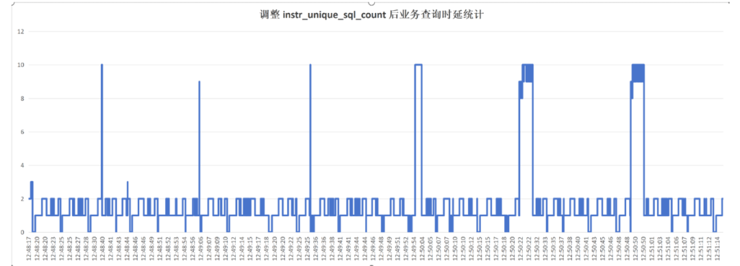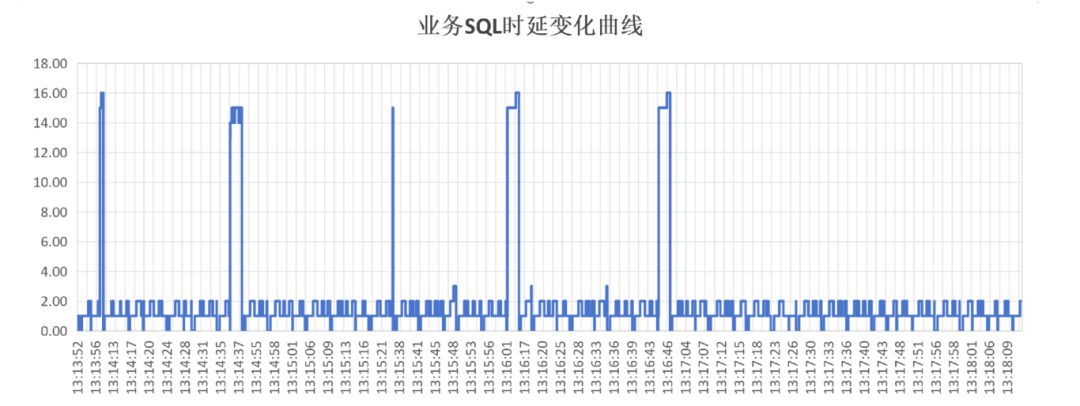 下图是调整后业务时延随时间的变化图,可以看到业务有周期性的长时延,这与dbe_perf.statement的周期性查询有关。当查询dbe_perf.statement时,会导致业务SQL执行时间显著上升。这与之前故障环境修改参数后产生大量超时报错现象上是一致的。