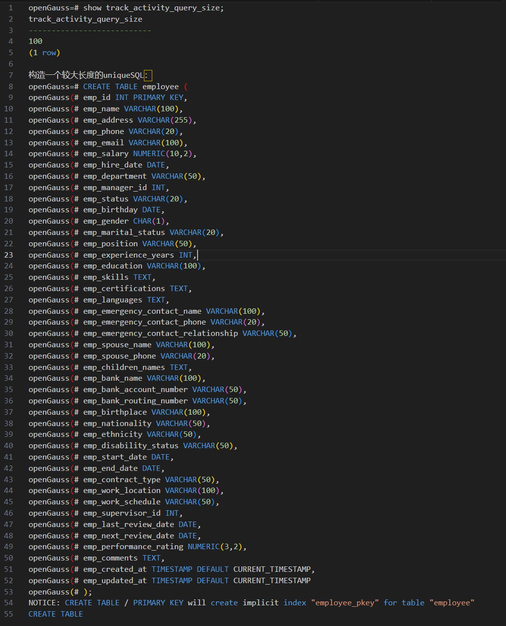 如果uniqueSQL超过track_activity_query_size该值,会导致数据库很多视图例如pg_stat_activity、db_perf.statement(uniqueSQL对应的视图)记录SQL出现截断,例如如下SQL测试用例