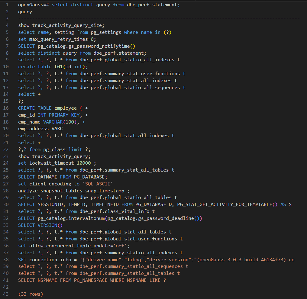 GaussDB、Opengauss内核会对所有上面形式的SQL语句汇总统计信息,通过视图呈现给用户。通过这种方式,可以排除一些无关的常量值的干扰,获得某一类SQL语句的统计数据,为性能分析和问题定位提供数值依据。