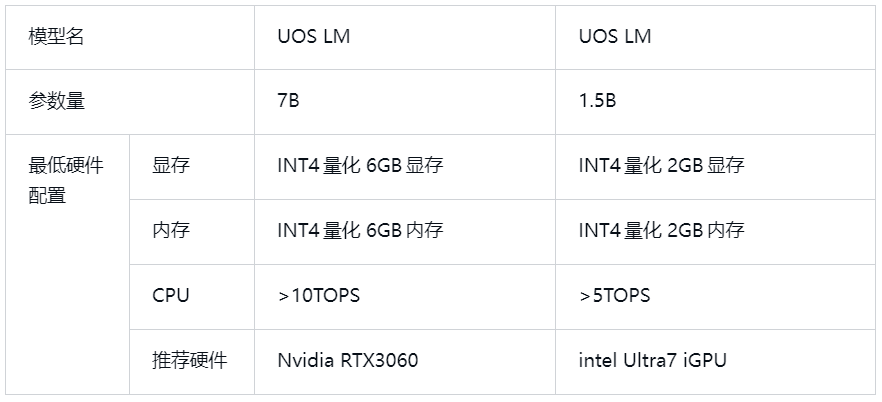 UOS LM的端侧模型与硬件做了深入绑定,经过了各项深入的性能测试和平台功能验证,UOS LM在端侧的硬件性能要求更加贴合用户实际情况: