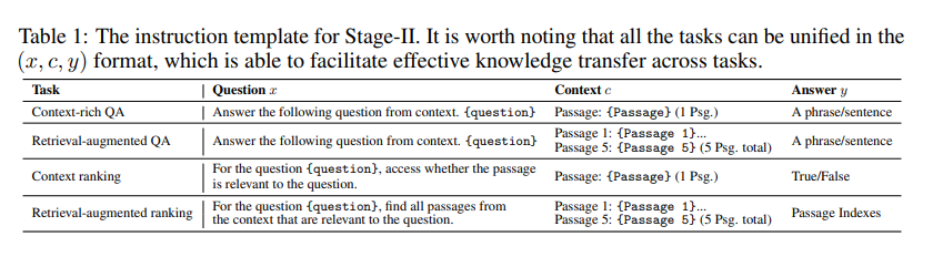 检索增强的问答数据: 为了提升模型对无关上下文的鲁棒性。作者采用了SQuAD和WebQuestions这两个数据集,这些数据集不仅包含答案上下文,还包括使用BM25检索到的最佳上下文。对于每个问题,作者将答案上下文与使用BM25检索到的最佳上下文结合,确保每个问题都能关联五个上下文。其中一些检索到的上下文可能不包含答案,这些被称为负样本。 上下文排序数据: 为提升LLM的上下文排序能力,作者使用了MS MARCO段落排序数据集。该数据集将问题-相关段落(q,c+)视为正例,而使用BM25检索到的困难负例段落(q,c-)视为负例。LLM需要根据问题判断段落是否与其相关,生成“True”或“False”。此外,由于针对对话问答的排名数据极为稀缺,作者利用对话问答对生成伪相关对,由于每个对话只与一个文档相关联,作者将每个文档切分为150字的片段。然后计算每个片段与真实答案之间的4-gram召回率,召回率高于0.5的片段被视为与对话相关,低于0.1的则被视为不相关。每个样本包含一个问题-上下文对用于该排序数据集。最终作者将两种数据结合,用于训练模型的上下文排序能力。 检索增强的排序数据: 为了提升模型同时评估多个上下文与问题相关性的能力,作者将SQuAD和WebQuestions中的答案上下文与BM25检索到的最佳上下文结合,确保每个问题能关联到五个上下文。其中包含答案的上下文被认为是相关的,训练LLM识别所有与问题相关的上下文。