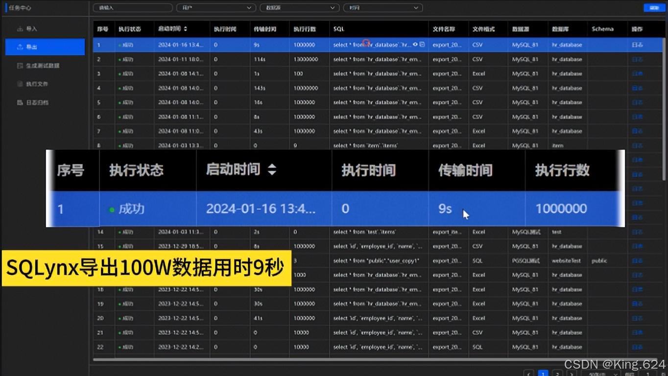 处理大数据速度迅猛:市面上的许多同类SQL工具在处理大数据量时往往力不从心,要么等待时间冗长,要么软件崩溃频发。SQLynx凭借自研算法,在数据处理速度和稳定性方面表现出色。例如,导出100万数据仅需9秒,与友商的42秒相比,差距一目了然,展现出了惊人的处理效率。