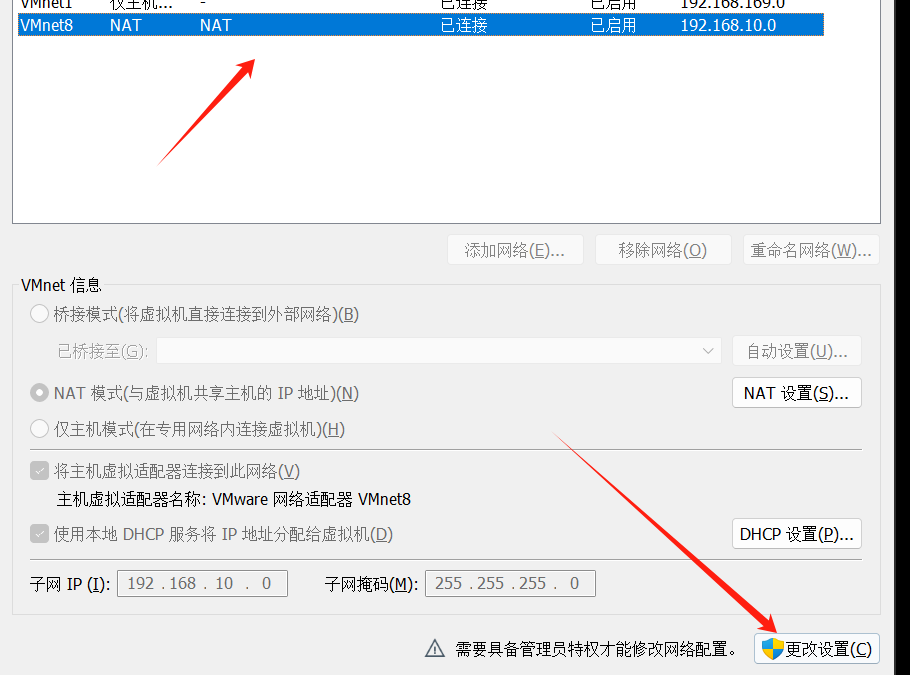 系统安装完成后,选择编辑->虚拟网络编辑器->更改设置