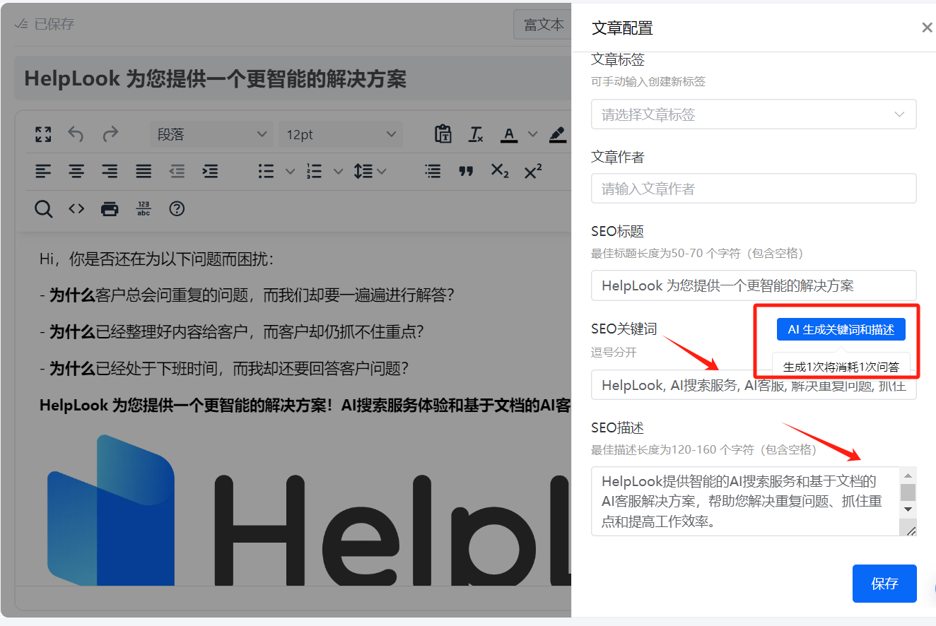 利用AI一键生成高质量的SEO关键词、描述和概述,从而优化搜索引擎排名。这些功能使得HelpLook在提供基础文档管理的同时,还能为企业带来更多的附加价值。