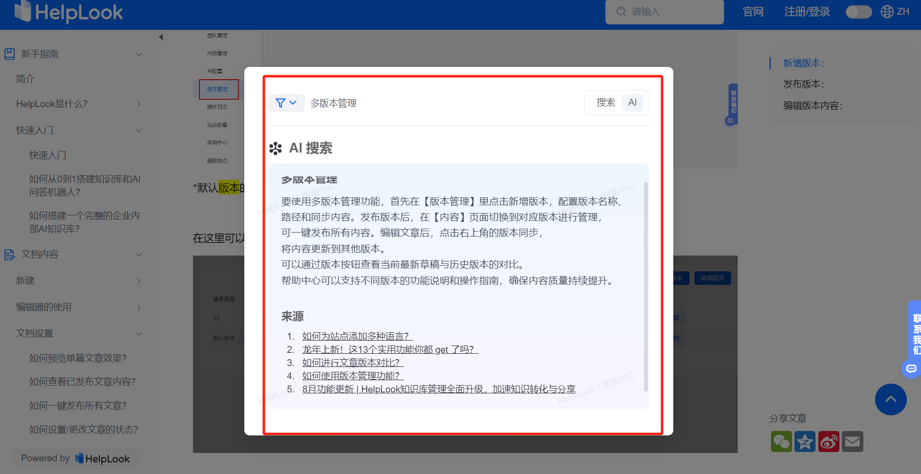 除了常规的单版本内搜索外,HelpLook还支持点击不同版本,搜索内容。用户可以在不同版本间轻松切换,确保在特定版本内只搜到当前版本的内容,避免了信息混淆和误导。