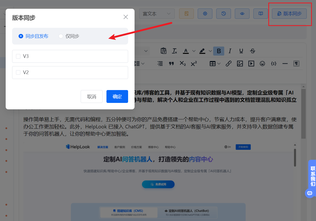 修改文章内容后,用户只需点击右上角的“版本同步”按钮,即可将内容同步更新到其他版本中。无需逐个版本手动更新,大大节省了时间和精力,提高了工作效率。