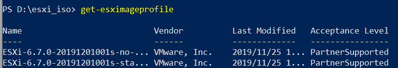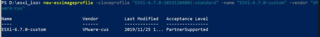 new-esximageprofile -cloneprofile "ESXi-6.7.0-20191204001-standard" -name "ESXi-6.7.0-custom" -vendor "VMware-cus"