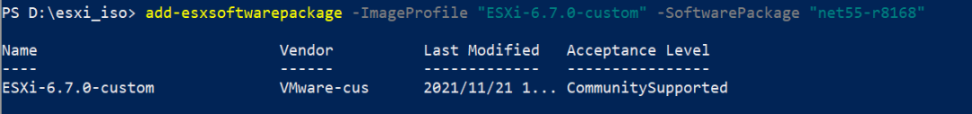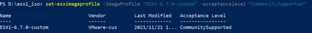 set-esximageprofile -ImageProfile "ESXi-6.7.0-custom" -acceptancelevel "CommunitySupported"