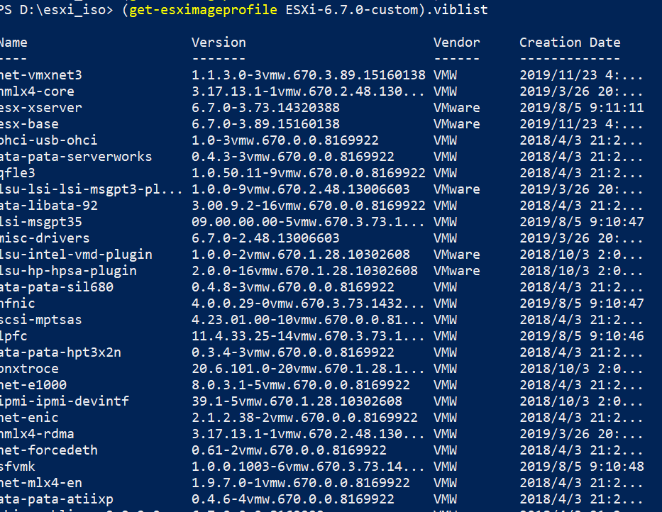 (get-esximageprofile ESXi-6.7.0-custom).viblist