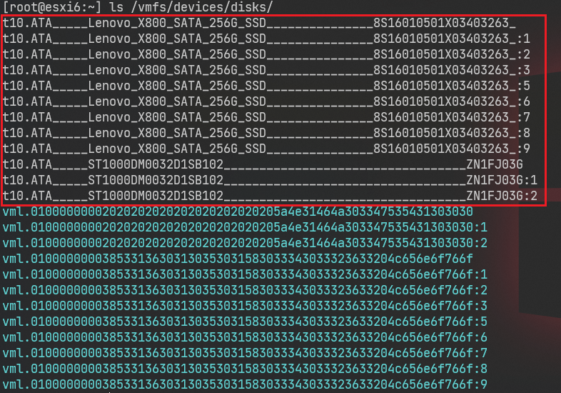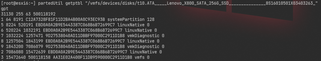partedUtil getptbl "/vmfs/devices/disks/t10.ATA_____Lenovo_X800_SATA_256G_SSD_______________8S16010501X03403263_"