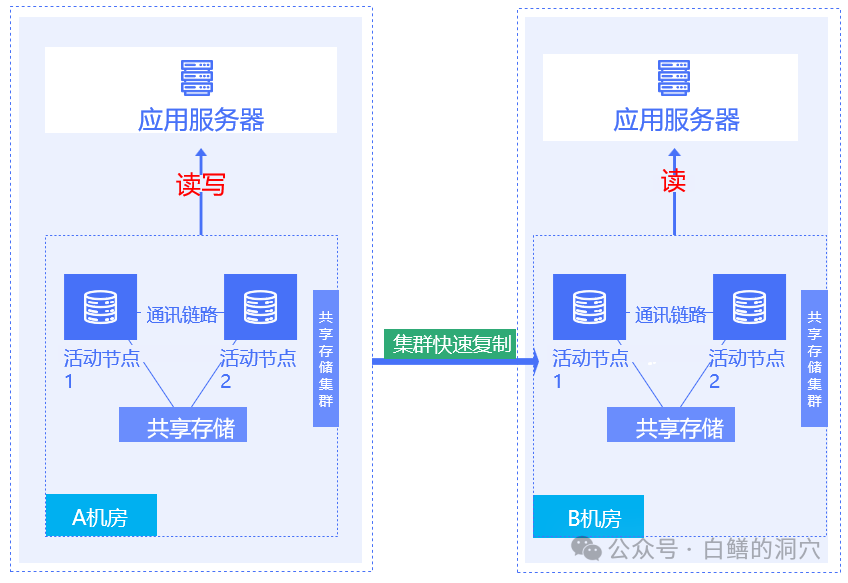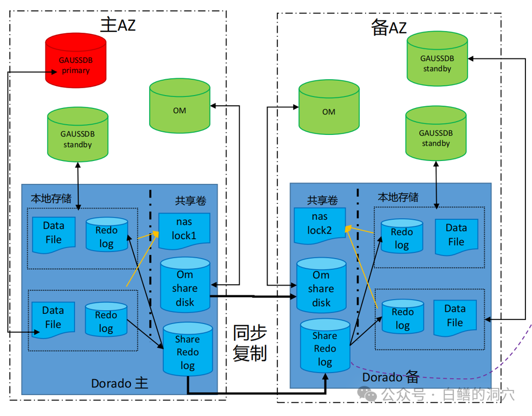 GaussDB在一些金融行业用户侧主推了一个基于Dorado双集群的高可用解决方案。采用的是GaussDB集中式部署模式,主库的Redo Log会写一份Shared Redo Log,这个Redo Log被Dorado同步复制到远程的另外一个Dorado集中式存储中,因此备AZ的GaussDB Standby数据库是零数据丢失的。这个和当年我们在Oracle ADG上实现零数据丢失的方案是一模一样的。