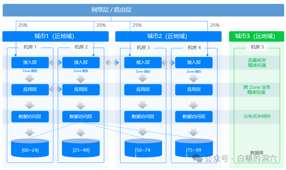 对于分布式数据库而言,其高可用解决方案则更为丰富,不过其建设成本也更高。我们以OceanBase为例,面对金融机构的业务连续性要求,在一套OceanBase分布式数据库集群中构建三地五中心的高可用架构。选择两个近地域,网络延时较低的城市的四个机房构建出四个业务ZONE,每个ZONE可以承担1/4的业务负载。而在较远地域的城市3建设第五个ZONE,如果你使用了4.X版本,第五个机房可以只放置日志,而不需要数据文件,从而节约成本。当然为了确保业务的性能,近地域机房之间的网络延时越低越好,最好能够低于2毫秒。