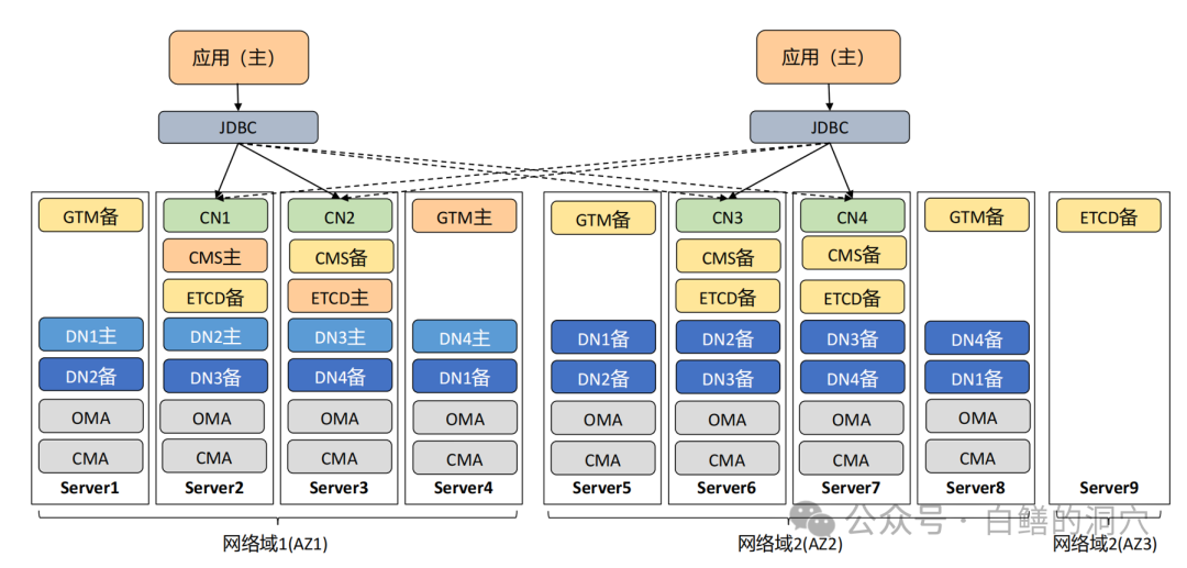 GaussDB也有类似的解决方案,上面是一个同城三中心双活的解决方案,AZ1/AZ2的8台服务器承担核心业务,可以通过全局负载均衡实现双活,AZ3只参与仲裁,因此在Server9上只部署了一个ETCD备实例。