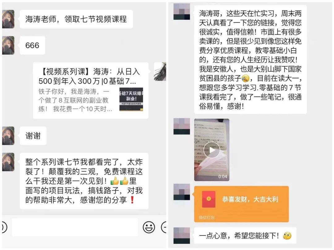 对于这个项目今年的爆发,我也觉得是目前非常大的一个红利。成本低、利润高,不需要囤货,只要有人下单,就能赚佣金,物流什么的根本不用管。算是草根翻身逆袭位数不多的轻创项目了。作为一个农村出身的底层屌丝,他通过深耕项目,挖掘技术,实现了跳跃式的发展和阶层的跨越。这份付出,钻研精神,这份认知实在是太值得年轻人学习。抛开具体项目,他做互联网这么多年为什么能持续做成功?核心秘密都在他给内部团队录制了一套课程中!《海涛:从日入500到年入300万|0基础7天玩赚网络》视频课程,信息量非常大。 通过我不断的软磨硬泡,他终于愿意将他的这套内部私密课程分享出来,他告诉我这套课程他花了一个月时间精心打磨,是他多年创业积累的精华,包含项目和流量。嘱咐我尽量不要外传,除了关系特别好的人!作为一个宠粉博主,我肯定是要分享给我的铁粉们,这套视频课程,只要添加海涛的微信,并且备注【数据库】,就全部免费发给你。下面是反馈,很多粉丝看完视频课程都觉得醍醐灌顶。(还有很多粉丝觉得课程价值巨大,给海涛发红包感谢,海涛老师一律没有收,着实佩服)