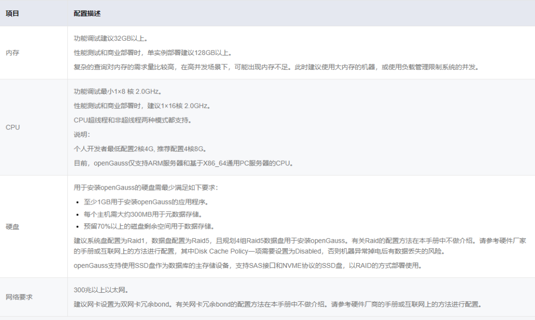下表列出了openGauss服务器应具备的最低硬件要求。在实际产品中,硬件配置的规划需考虑数据规模及所期望的数据库响应速度。请根据实际情况进行规划。
